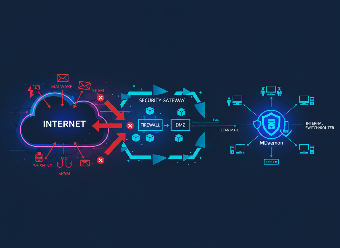 - SecurityGateway es un filtro perimetral que se coloca “delante” de MDaemon (o de cualquier servidor) para analizar y limpiar el tráfico entrante y saliente.